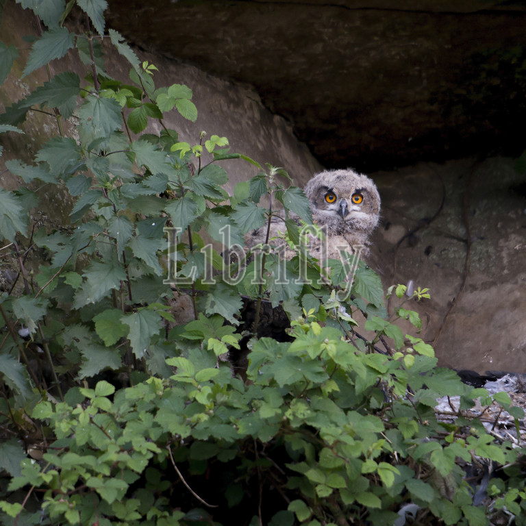 Young Eurasian Eagle-Owl on nest, Bubo bubo, Germany