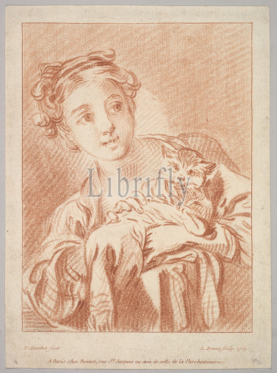 A Young Girl holding a Cat, 1769, Crayon-manner engraving printed in sanguine ink; second state of two, Sheet (trimmed): 8 3/16 in. × 6 in. (20.8 × 15.3 cm), Prints, Louis Marin Bonnet (French, Paris 1736–1793 Saint-Mandé, Val-de-Marne), After François Boucher (French, Paris 1703–1770 Paris)