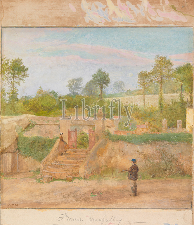 A Young Lover, John William North, 1842–1924, British, 1867, Watercolor and gouache on medium, slightly textured cream wove paper mounted on very thick, slightly textured cream wove paper, Sheet: 6 5/8 x 7 inches (16.8 x 17.8 cm), beret, boy, dress (costume), garden, gate, genre subject, girl, hunter, lovers, shotgun, steps, trees