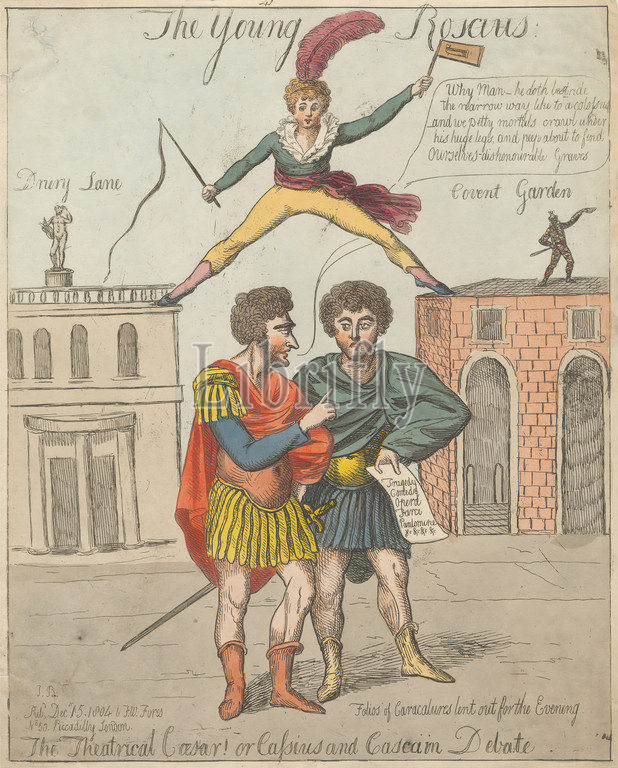 Young Roscius, Print, J, B., 1804, Hand-colored etching, medium, smooth, cream wove paper, Sheet, Image, arches, blocks, boots, breeches, buildings, cloaks, collar, columns, costume, doors, feather, literary theme, lyre, men, nude, paper, pedestal, plume, roofs, ruffle, sash, shirt, shoes, statue, steps, stockings, sword, theater, whip, windows, Covent Garden, Drury Lane