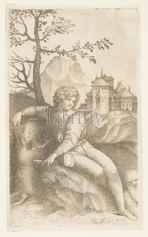 Young shepherd seated, landscape looking, old man, lower right, buildings, background, tree, mountain, left, ca, 1509–12, Engraving, stipple, Plate, 5 1/4, 3 1/8, 13.3, 7.9 cm, Prints, Giulio Campagnola, Italian, Padua ca., 1482–ca., 1515/18 Venice, After, Giorgione, Castelfranco Veneto, 1477/78–1510, Venice