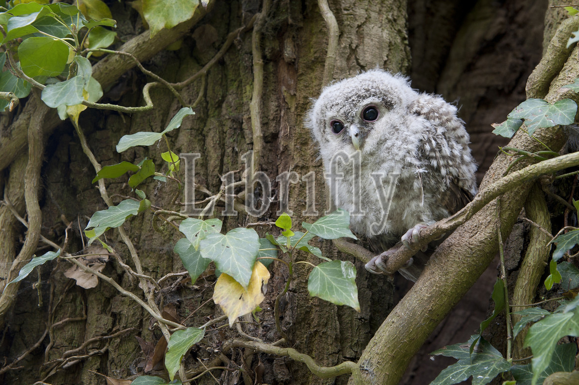 Young Tawny Owl in hedera, Strix aluco, The Netherlands