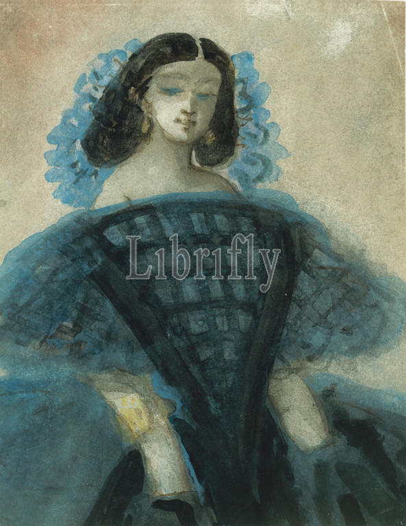 Young Woman, Blue, Black Dress, ca, 1863, Pen, brown ink, watercolor wash, off-white wove paper, 8 1/2 x 6 5/8, 21.6 16.8 cm, Drawings, Constantin Guys, French, Flushing, 1802–1892, Paris