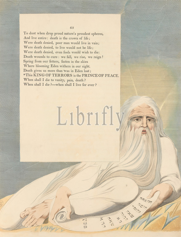 Young's Night Thoughts, Page 63, 'This King of Terrors Is the Prince of Peace', Print made by William Blake, 1757–1827, British, 1797, Etching and line engraving with watercolor on moderately thick, slightly textured, cream wove paper, Spine: 17 1/2 inches (44.5 cm), Sheet: 16 3/4 x 12 1/2 inches (42.5 x 31.8 cm), and Plate: 16 1/4 x 12 1/2 inches (41.3 x 31.8 cm), beard, literary theme, man, paper, religious and mythological subject, scroll (information artifact), text