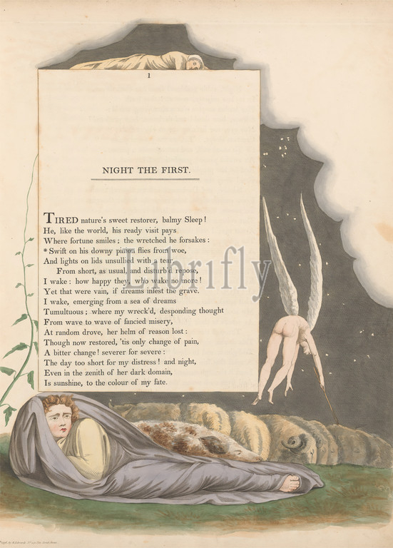 Young's Night Thoughts, Page 1, 'Swift on His Downy Pinion Flies from Woe', Print made by William Blake, 1757–1827, British, 1797, Etching and line engraving with watercolor on moderately thick, slightly textured, cream wove paper, Spine: 17 1/2 inches (44.5 cm), Sheet: 16 3/4 x 13 inches (42.5 x 33 cm), and Plate: 15 5/8 x 12 3/8 inches (39.7 x 31.4 cm), angel, blanket, clouds, grass, literary theme, night, nudes, religious and mythological subject, sheep, shroud, sleeping, stars, text, vine, wings