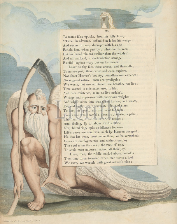 Young's Night Thoughts, Page 24, 'Time, in Advance, behind Him Hides His Wings', Print made by William Blake, 1757–1827, British, 1797, Etching and line engraving with watercolor on moderately thick, slightly textured, cream wove paper, Spine: 17 1/2 inches (44.5 cm), Sheet: 16 1/2 x 12 7/8 inches (41.9 x 32.7 cm), and Plate: 15 3/4 x 12 7/8 inches (40 x 32.7 cm), angel, beard, clouds, gown, hourglass, literary theme, man, men, religious and mythological subject, text, time, women