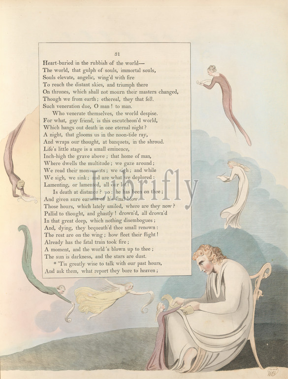 Young's Night Thoughts, Page 31, ''Tis Greatly Wise to Talk with Our Past Hours', Print made by William Blake, 1757–1827, British, 1797, Etching and line engraving with watercolor on moderately thick, slightly textured, cream wove paper, Spine: 17 1/2 inches (44.5 cm), Sheet: 16 1/2 x 12 7/8 inches (41.9 x 32.7 cm), and Plate: 16 1/8 x 12 3/4 inches (41 x 32.4 cm), chair, literary theme, men, paper, religious and mythological subject, scrolls, seated, sitting, text, women