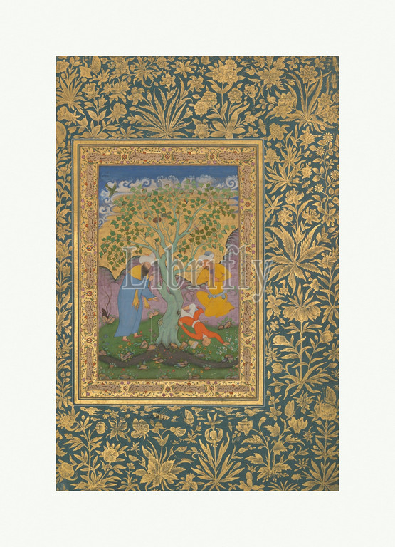 Youth Fallen, Tree, Folio, Shah Jahan Album, verso, ca, 1610, recto, 1530, Attributed, India, Ink, opaque watercolor, gold, paper, H, 15 3/8, 39 cm, Codices, Painting by Aqa Riza, Iranian, born Meshhed, ca., 1560, active until ca., 1621