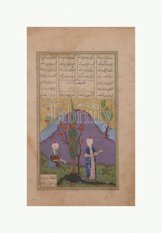 'A Youth and a Noble Conversing by a Stream', Folio from a Dispersed Manuscript, late 16th century, Attributed to Iran, Ink, opaque watercolor, silver, and gold on paper, 10.5 in. high 7.50 in. wide (26.7 cm high 19.1 cm wide), Codices