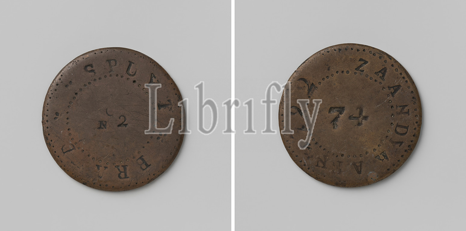 Zaandijk, fire spray token, sprayer 2, no, 74, Brass token, Front, number no, 2 inside, cover, Reverse, digit 74 inside, circle, 1722, brass, alloy, engraving