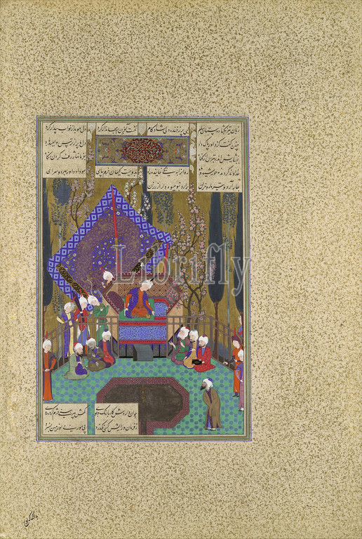 Zal Consults, Magi, Folio 73v, Shahnama, Book, Kings, Shah Tahmasp, ca, 1530–35, Iran, Tabriz, Opaque watercolor, ink, silver, gold, paper, Painting, H, 11 1/16 x W, 7 1/4, 28.1, 18.4 cm, Codices, Painting attributed to Sultan Muhammad, active first half 16th century, painting, Zal, depicted enthroned, consults, magi, Zoroastrian wise men, win, father, approval, marry Rudaba, granddaughter, evil king, Zahhak, phoenix, bird, canopy, refer, simurgh, saved, nurtured, infant Zal, parents, rejected, albino