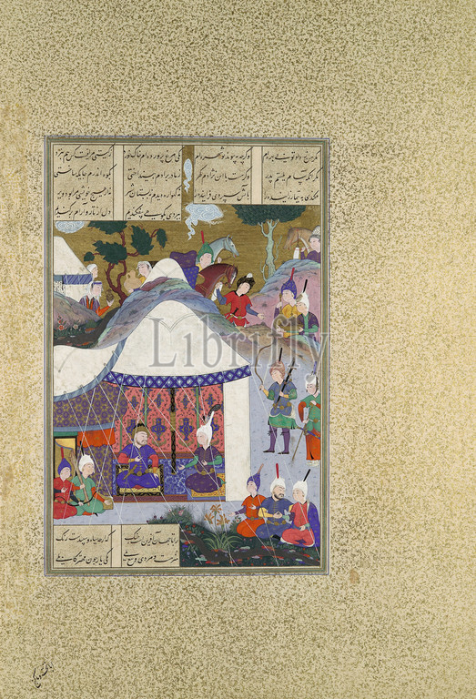 Zal Questions Sam, Intentions Regarding, House, Mihrab, Folio 81v, Shahnama, Book, Kings, Shah Tahmasp, ca, 1525–30, Iran, Tabriz, Opaque watercolor, ink, silver, gold, paper, Painting, H, 11 x W, 7 1/8, 28, 18.2 cm, Codices, Painting attributed to 'Abd al-'Aziz, active first half 16th century, word, spreads, Kabul, Sam will, soon, waging war, decides, fight, defend Rudaba, father, returns, meet, Sam, determined, win, reminds, broken promise, hatches, plan