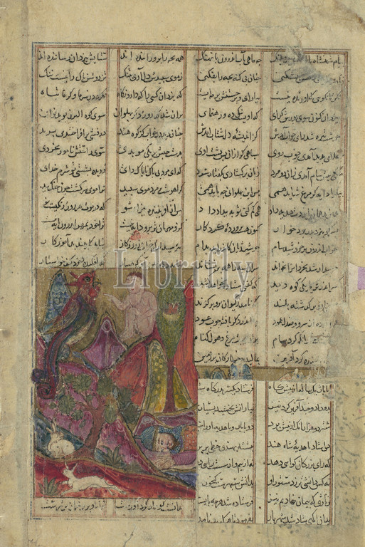 Zal, Simurgh, Nest, Folio, Shahnama, Book, Kings, ca, 1330–40, Attributed, Iran, Isfahan, Ink, opaque watercolor, gold, silver, paper, Page, 8 x 5 1/8, 20.3 13 cm, Codices, Left, wilderness, baby, father Sam thought, white hair, attribute, devil, rescued, nest, Mt, Elburz, Rumors eventually, reached, Sam, came, reclaim, son, thank, great bird