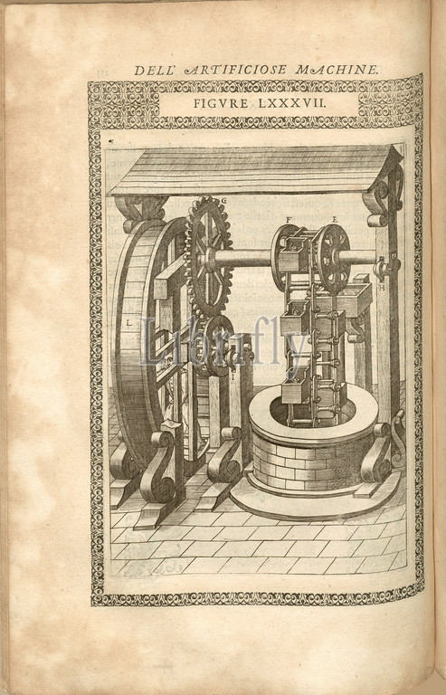 Ziehbrunnen, 13, Drawing well, rope winch construction, copperplate engraving, fig. LXXXVII, p. 133, 1588, Agostino Ramelli, Le diverse, artificiose machine del capitano Agostino Ramelli, A Parigi, Casa del'autore, 1588