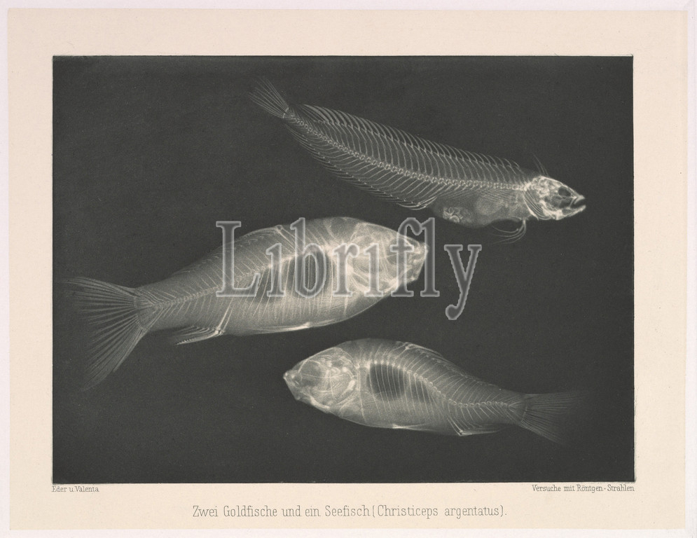 Zwei Goldfische und ein Seefisch, Christiceps argentatus, 1896, Photogravure, Image, 4 15/16, 6 9/16, 12.5, 16.6 cm, Photographs, Josef Maria Eder, Austrian, Krems an der Donau, 1855–1944, Kitzbühel, and, Eduard Valenta, 1857–1937, Eder, director, institute, graphic processes, author, early history, photography, photochemist, produced, portfolio, January 1896, less, month, Wilhelm Conrad Röntgen, published, discovery, X-rays